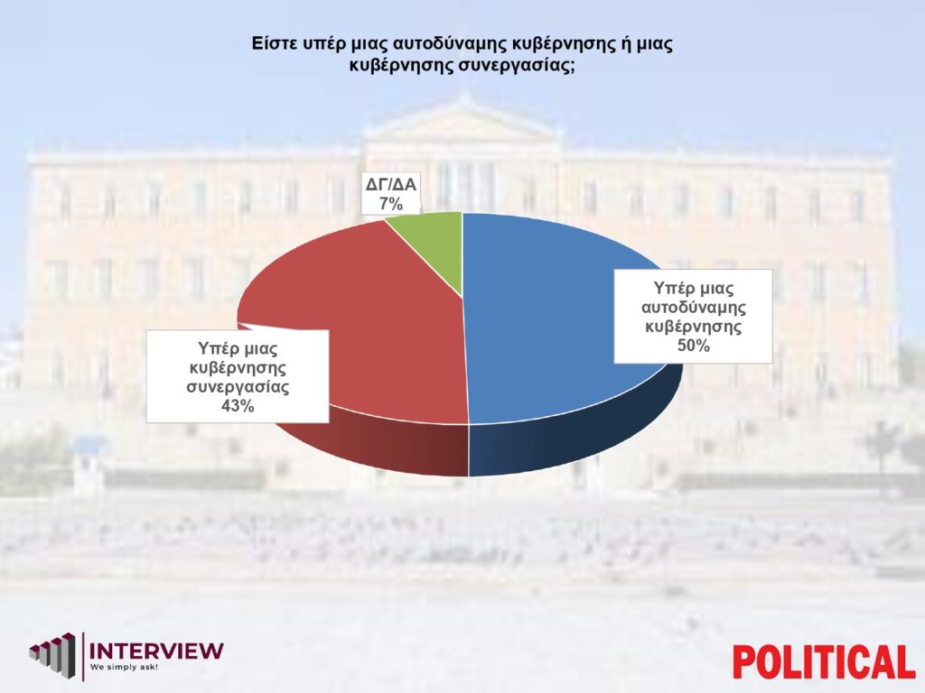 Στο ερώτημα αν «είστε υπέρ μιας αυτοδύναμης κυβέρνησης ή μιας κυβέρνησης συνεργασίας», οι πολίτες τάσσονται σε ποσοστό 50% υπέρ μιας αυτοδύναμης κυβέρνησης, με το 43% να επιθυμεί σχηματισμό κυβέρνησης συνεργασίας και το 7% να μην εκφέρει γνώμη.