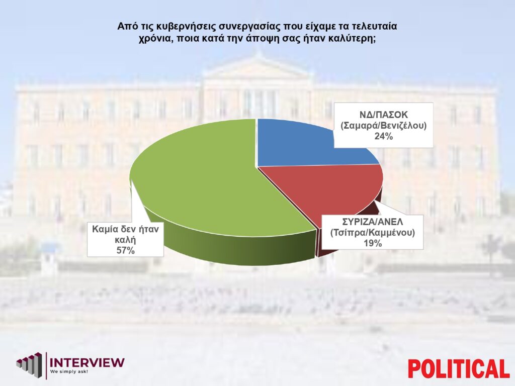 Στην ερώτηση ποια από τις κυβερνήσεις συνεργασίας που είχαμε τα τελευταία χρόνια ήταν καλύτερη, απαντούν «καμία δεν ήταν καλή» 57%, η κυβέρνηση ΝΔ/ΠΑΣΟΚ (Σαμαρά/Βενιζέλου) 24% και ΣΥΡΙΖΑ/ΑΝΕΛ (Τσίπρα/Καμμένου) 19%.