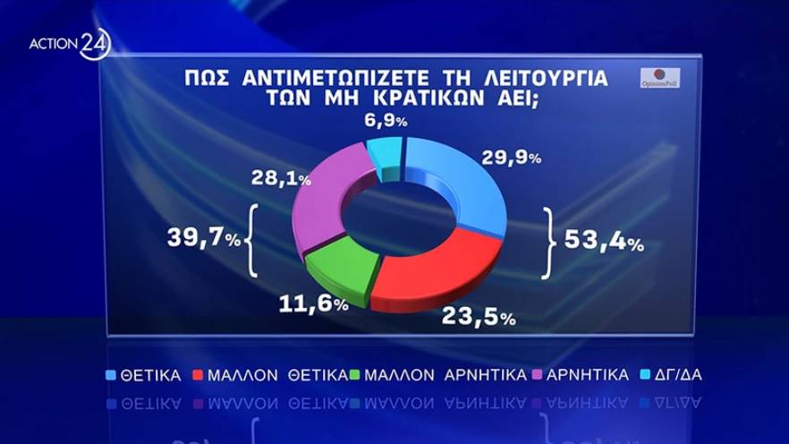 Το 53,4% αντιμετωπίζει θετικά ή μάλλον θετικά την προοπτική ίδρυσης ιδιωτικών ΑΕΙ, ενώ το 39,7% αρνητικά ή μάλλον αρνητικά.