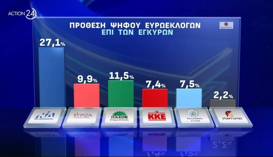 Στην πρόθεση ψήφου για τις ευρωεκλογές, η ΝΔ συγκεντρώνει 27,1%, το ΠΑΣΟΚ 11,5%, ο ΣΥΡΙΖΑ 9,9%, η Ελληνική Λύση 7,5%, το ΚΚΕ 7,4%, το κόμμα Νίκη 3%, η Πλεύση Ελευθερίας 2,9%, η Νέα Αριστερά 2,6%, οι Σπαρτιάτες 2,2% και το ΜέΡΑ25 1,9%. Στο 21% οι αναποφάσιστοι.