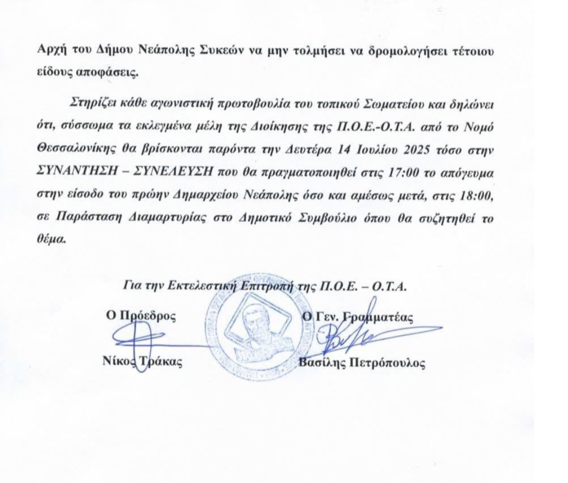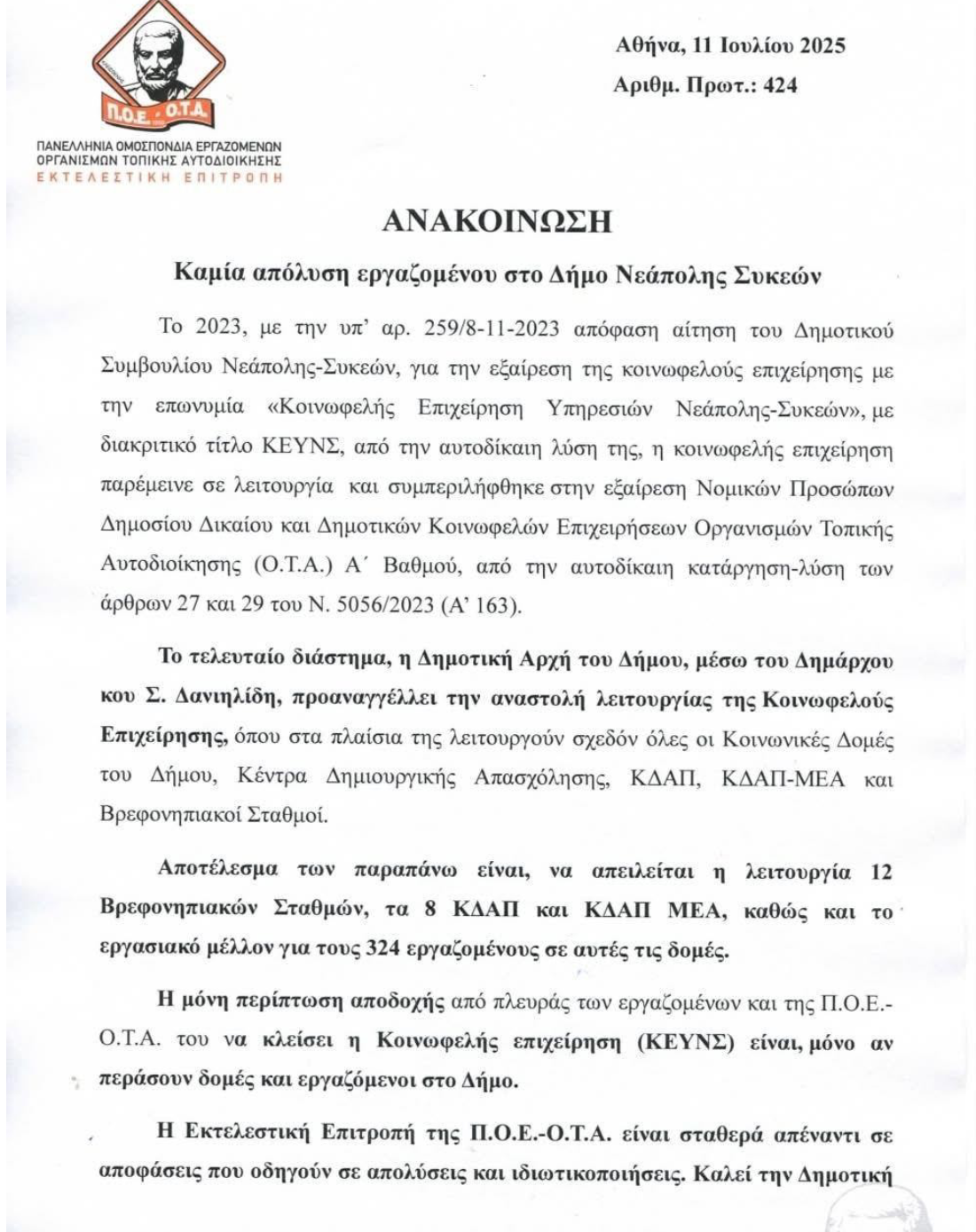 Η Εκτελεστική Επιτροπή της Πανελλήνιας Ομοσπονδίας Εργαζομένων Οργανισμών Τοπικής Αυτοδιοίκησης εξέδωσε ανακοίνωση στην οποία αναφέρεται ως πιθανή, απόφαση του δημοτικού συμβουλίου του Δήμου Νεάπολης Συκεών, για την αναστολή λειτουργίας της Κοινωφελούς Επιχείρησης, στα πλαίσια της οποίας, λειτουργούν σχεδόν όλες οι Κοινωνικές Δομές του Δήμου, δηλαδή τα Κέντρα Δημιουργικής Απασχόλησης (Κ.Δ.Α.Π.), Κ.Δ.Α.Π.- ΜΕΑ και οι Βρεφονηπιακοί Σταθμοί.