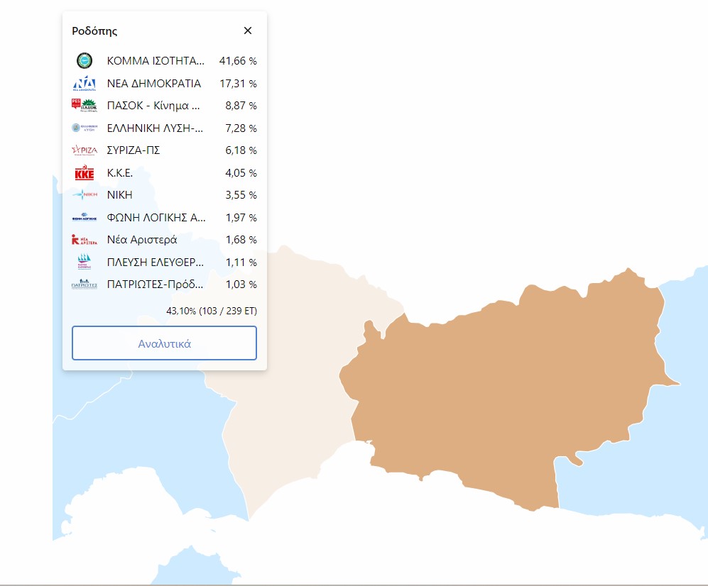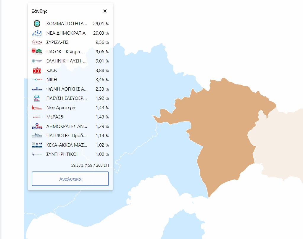 Πιο συγκεκριμένα, οι νομοί Ξάνθης και Ροδόπης, στον χάρτη του υπουργείου Εσωτερικών είναι… «σομόν» αντί για «μπλε» καθώς το κόμμα που έρχεται πρώτο στο 59,33% και 43,10% ενσωμάτωσης αντίστοιχα, είναι το «ΚΟΜΜΑ ΙΣΟΤΗΤΑΣ, ΕΙΡΗΝΗΣ ΚΑΙ ΦΙΛΙΑΣ».