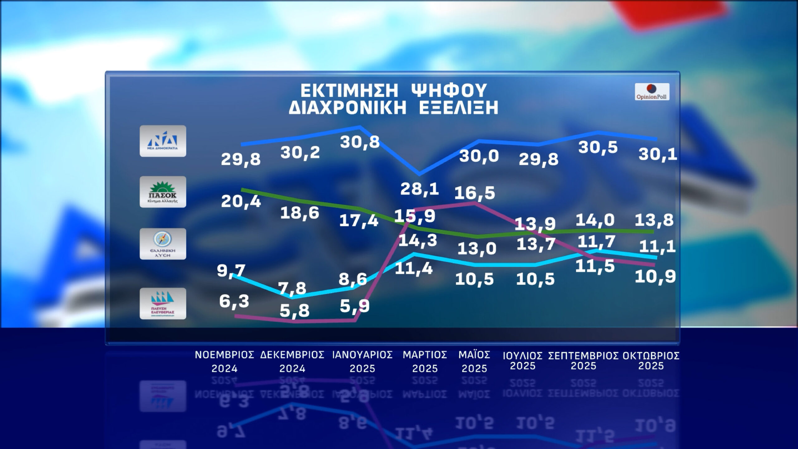 Σύμφωνα με την Πανελλαδική Πολιτική έρευνα της OPINION POLL που υλοποιήθηκε στο διάστημα 7/10 έως και 10/10 για λογαρισμό του ACTION 24 και σε δείγμα 1005 νοικοκυριών η Ν.Δ σημειώνοντας στην εκτίμηση ψήφου οριακή μείωση 0.4% εμφανίζεται με επίδοση 30.1% έναντι του σταθερά δεύτερου ΠΑΣΟΚ που χάνοντας μόλις 0.2% βρίσκεται στο 13.8%. Έτσι η μεταξύ τους διαφορά είναι 16.3%.