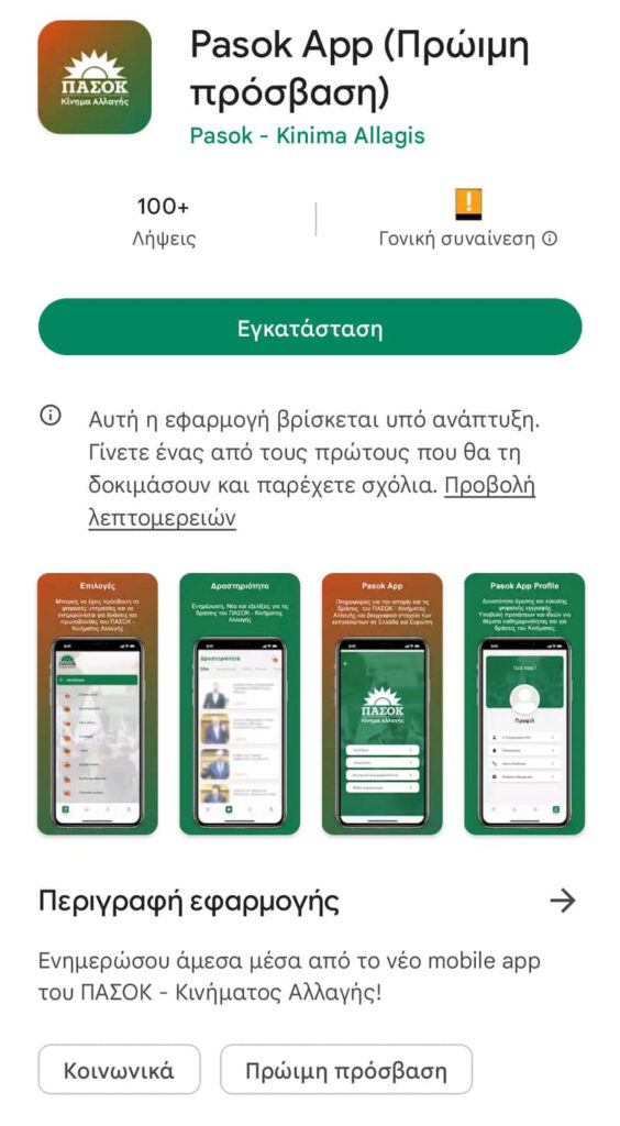Η εφαρμογή είναι αρχικά διαθέσιμη ως πρώτη έκδοση (πιλοτική λειτουργία) σε android ενώ σύντομα θα είναι διαθέσιμη και για κινητά με λειτουργικό apple ios. Μπορείτε να δείτε περισσότερα για την εφαρμογή σε android εδώ: https://digitalsociety.gr/mobile ή να την αναζητήσετε με “Pasok App” στο Google Play.