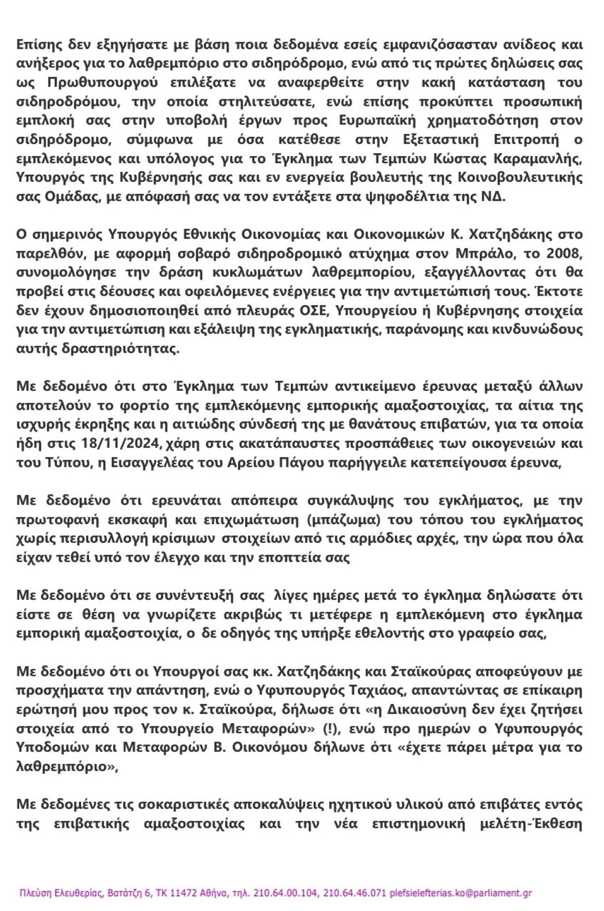 Mε επίκαιρη ερώτηση, την 128η προς τον πρωθυπουργό, η Ζωή Κωνσταντοπούλου καλεί στη Βουλή, στα πλαίσια του Κοινοβουλευτικού Ελέγχου, τον Κ. Μητσοτάκη να απαντήσει, για το λαθρεμπόριο καυσίμων και επικίνδυνων υλών στο σιδηροδρομικό δίκτυο της χώρας»