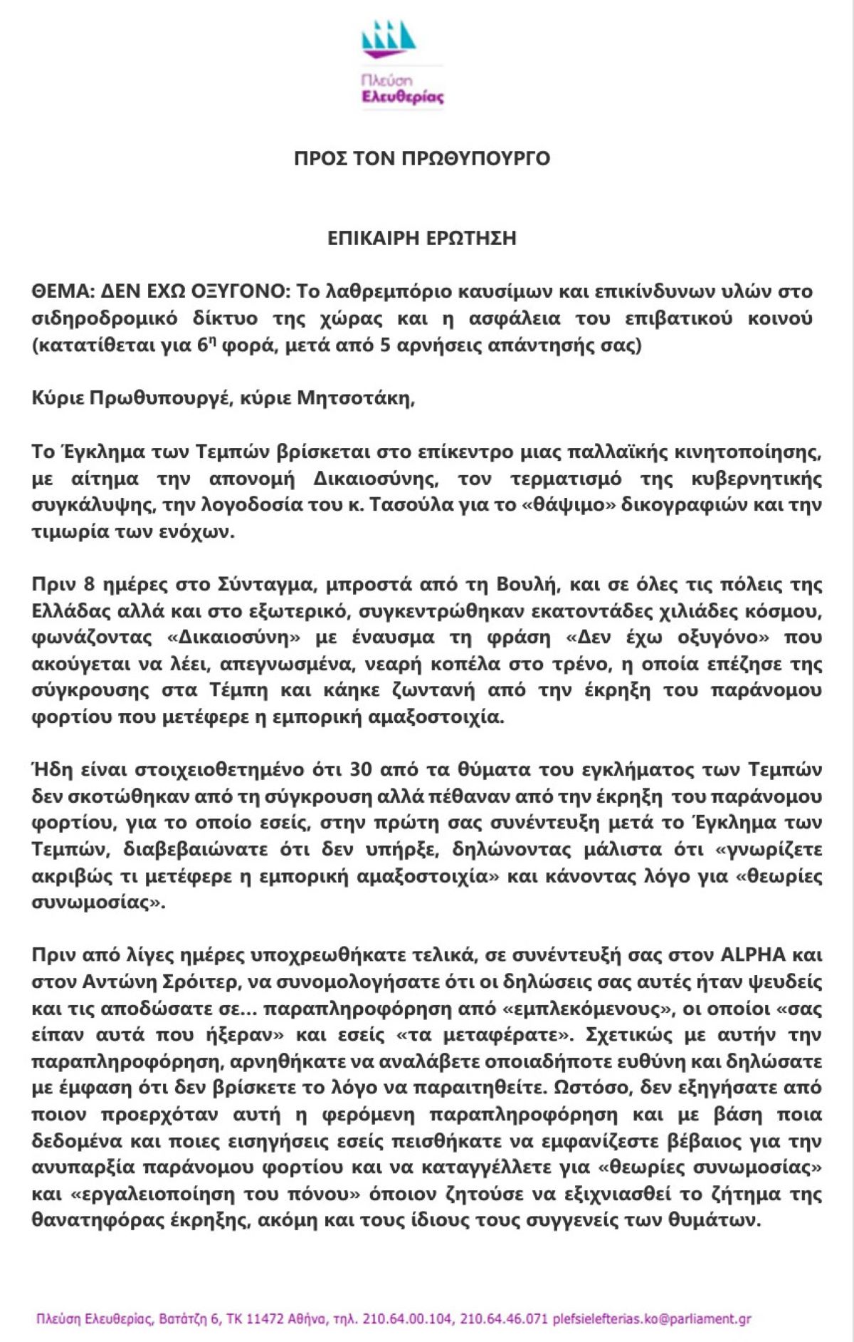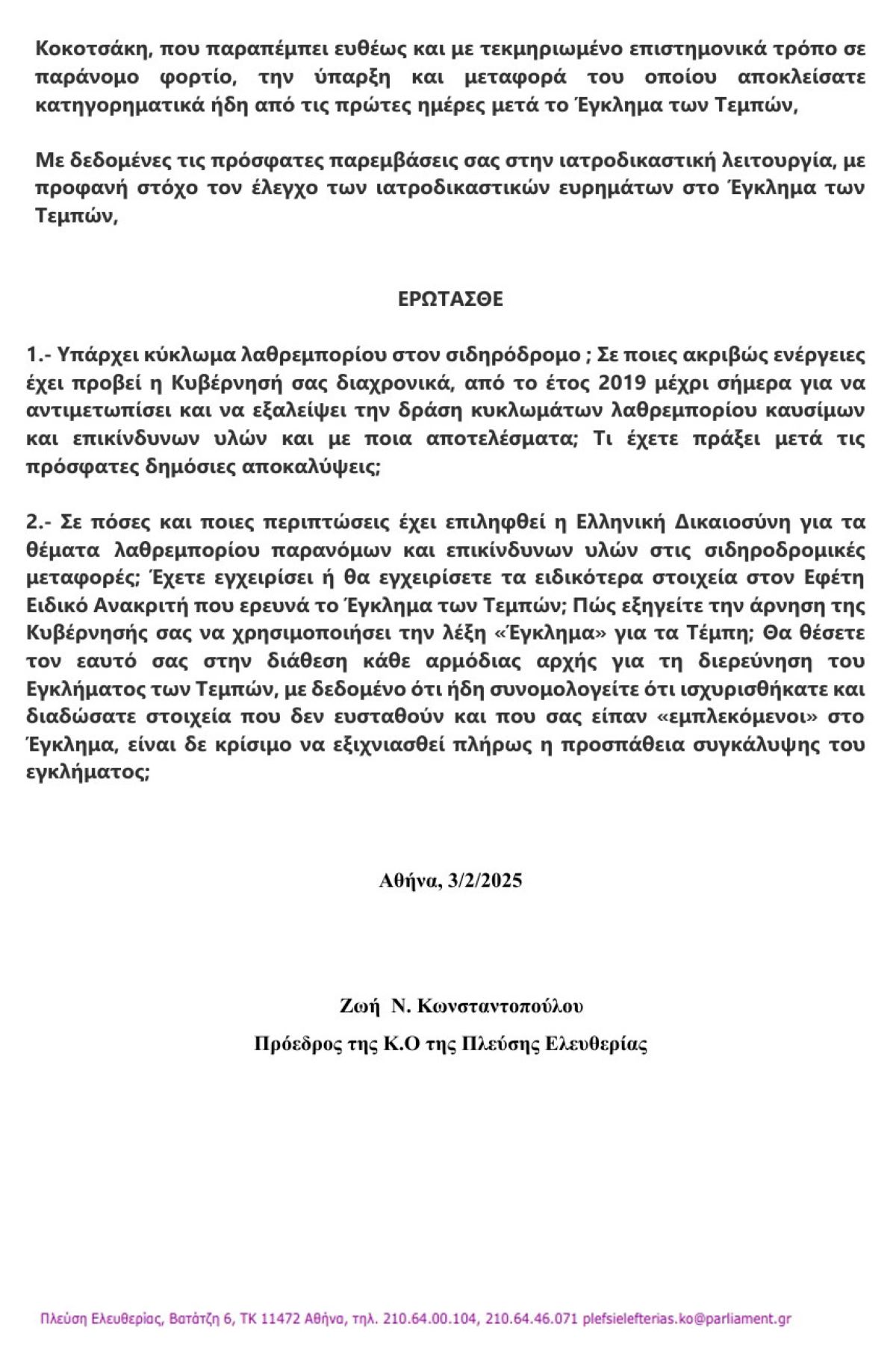 Επίσης, η Πλεύση Ελευθερίας τονίζει, ότι, «η Ζωή ρωτάει τον Πρωθυπουργό, σε πόσες και ποιες περιπτώσεις έχει επιληφθεί η Ελληνική Δικαιοσύνη για τα θέματα λαθρεμπορίου παρανόμων και επικίνδυνων υλών στις σιδηροδρομικές μεταφορές και εάν έχει εγχειρίσει ή θα εγχειρίσει τα ειδικότερα στοιχεία στον Εφέτη Ειδικό Ανακριτή που ερευνά το Έγκλημα των Τεμπών.