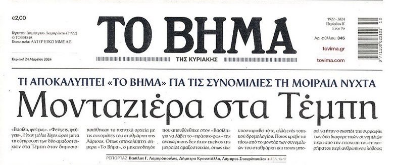 “Το σημερινό πρωτοσέλιδο δημοσίευμα της εφημερίδας «Το ΒΗΜΑ της Κυριακής» αποτελεί δημοσιογραφική κηλίδα στην ιστορική πορεία της, καθώς προβάλλει σενάρια συνωμοσίας γύρω από τα αίτια της τραγωδίας των Τεμπών, που πληγώνει όλους τους Έλληνες.