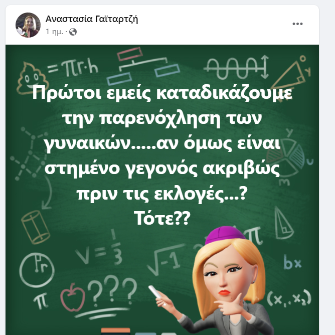 «Πρώτοι εμείς καταδικάζουμε την παρενόχληση των γυναικών…..αν όμως είναι στημένο γεγονός ακριβώς πριν τις εκλογές…? Τότε??» έγραψε στο facebook η υποψήφια βουλεύτρια με τον ΣΥΡΙΖΑ στη Β’ Θεσσαλονίκης, Αναστασία Γαϊταρτζή.