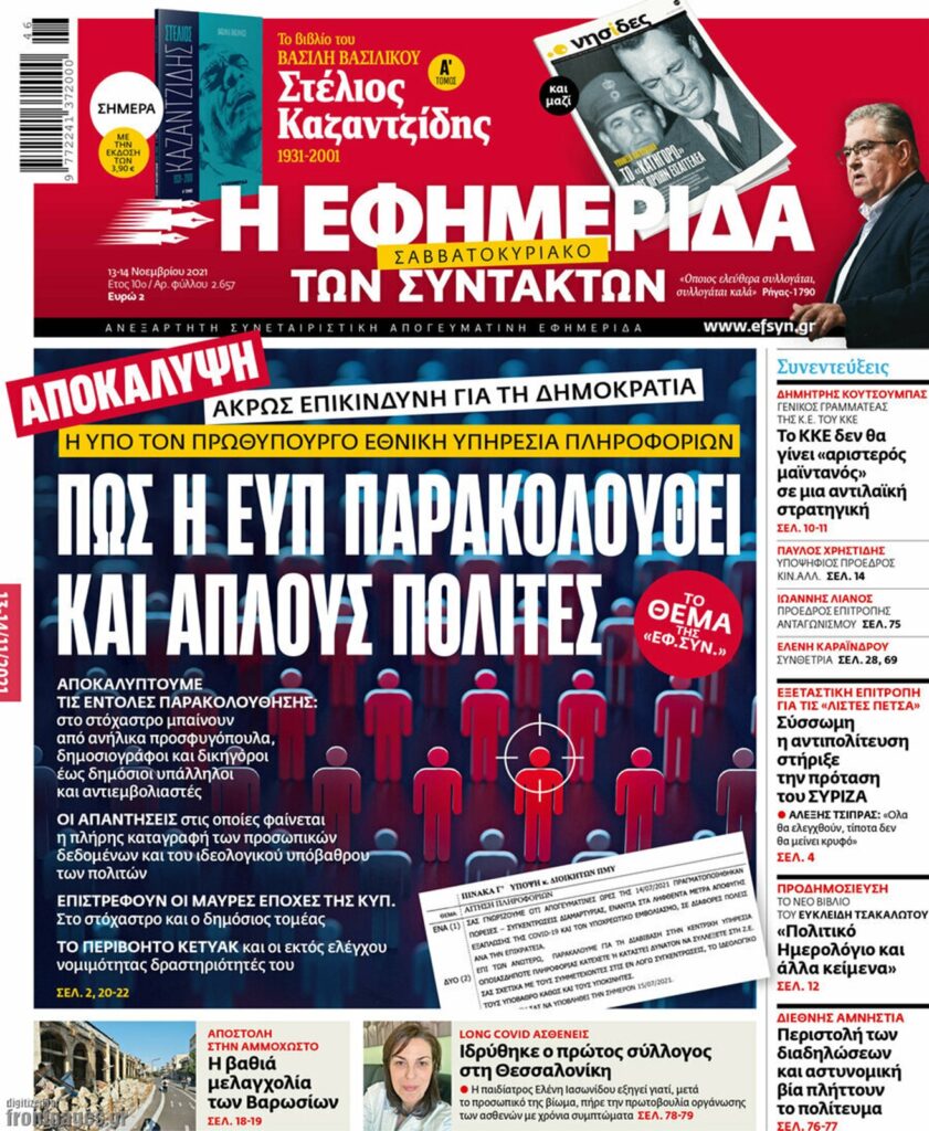 Τη Δευτέρα 15 Νοεμβρίου 2021 η ίδια εφημερίδα συνεχίζει το θέμα και κυκλοφορεί με βασικό τίτλο “Φτιάχνουν ΕΥΠ στα μέτρα της Μαξίμου Α.Ε.”. Σε αυτό το δημοσίευμα επισημαίνεται η σιγή ιχθύος από την κυβέρνηση για τις μαζικές παρακολουθήσεις πολιτών.