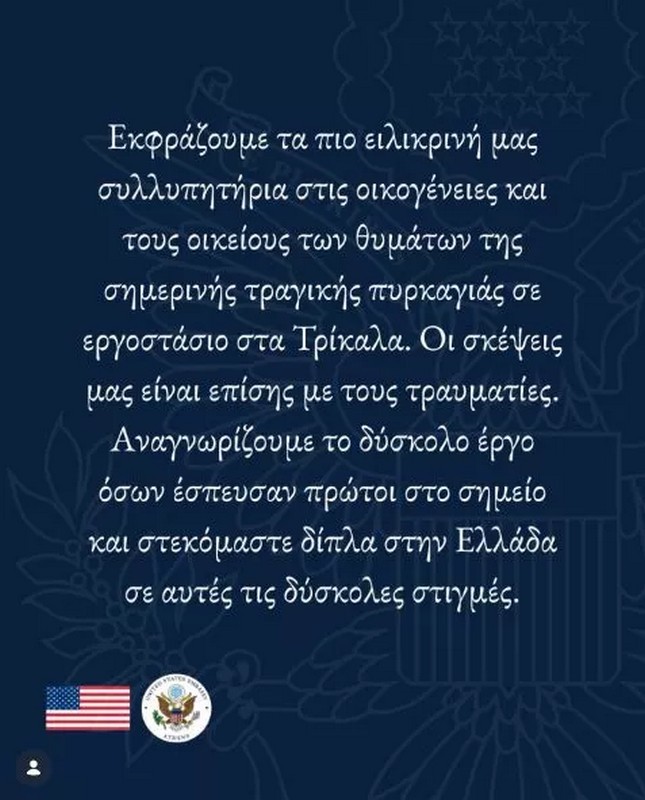 Τα συλλυπητήριά τους στις οικογένειες των θυμάτων της φονικής πυρκαγιάς στο εργοστάσιο «Βιολάντα» στα Τρίκαλα εξέφρασαν η πρεσβεία των ΗΠΑ και η Κίμπερλι Γκίλφοϊλ μέσω ανάρτησης στο Instagram.