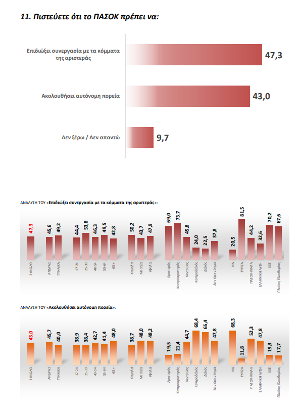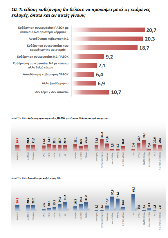 Μόλις το 20,3% θέλει μια αυτοδύναμη κυβέρνηση της ΝΔ ενώ απεναντίας το 20,7% θα επιθυμούσε μια κυβέρνηση συνεργασίας ΠΑΣΟΚ με κάποια άλλα αριστερά κόμματα, το 18,7% ζητά μια κυβέρνηση συνεργασίας των κομμάτων της Αριστεράς ενώ μόλις το 9,2% θα ήθελε να δεί ξανά μαζί να συγκυβερνούν η ΝΔ και το ΠΑΣΟΚ.