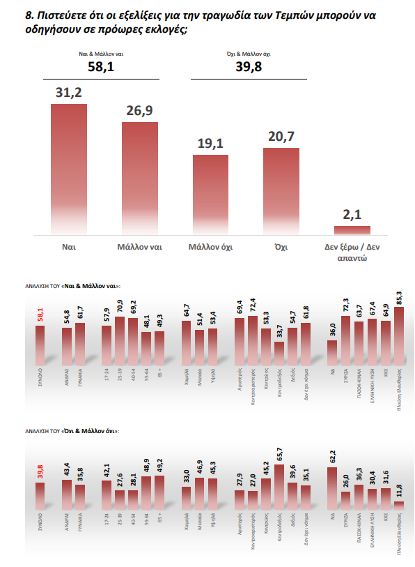 Το 58,1% εκτιμά ότι οι εξελίξεις για την τραγωδία στα Τέμπη μπορούν να οδηγήσουν σε πρόωρες εκλογές με το 53,9% των ερωτηθέντων να τις θέλει άμεσα.