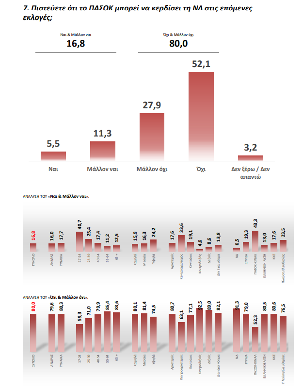 Η “παράσταση νίκης” για το ΠΑΣΟΚ είναι ίσως το πιο κρίσιμο εύρημα της δημοσκόπησης καθώς περισσότεροι από τους μισούς ψηφοφόρους του δεν θεωρούν ότι μπορεί να κερδίσει τη ΝΔ.