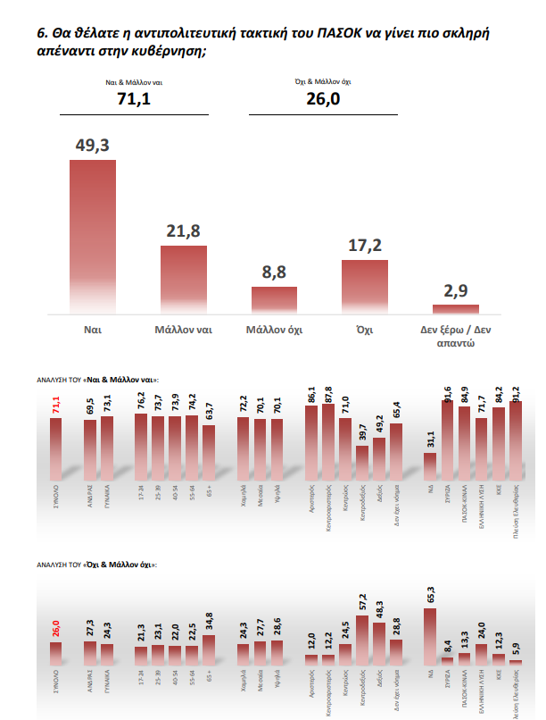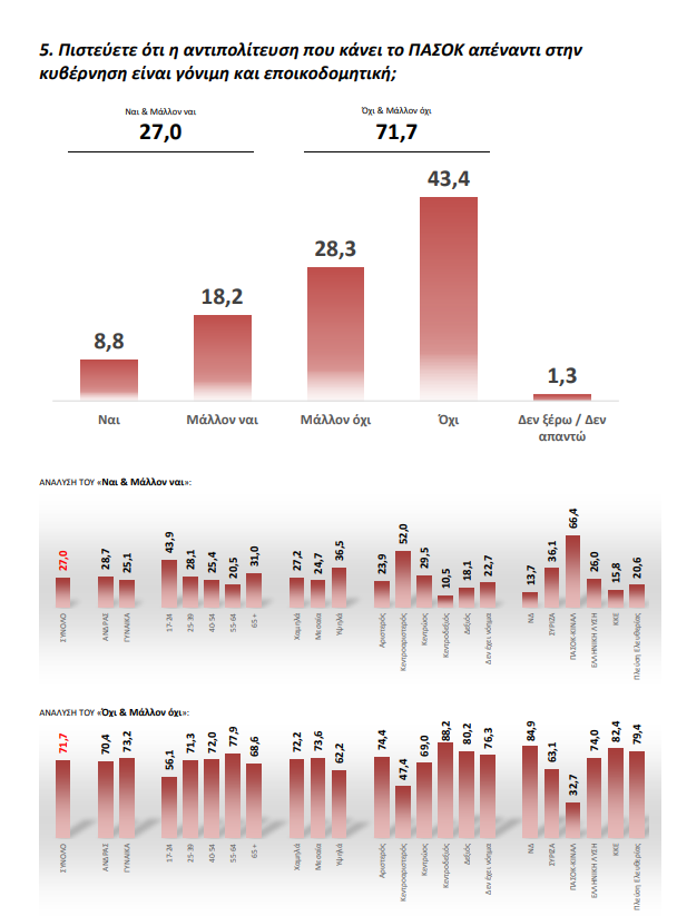 Παράλληλα μόλις το 27% των πολιτών αποτιμά θετικά την αντιπολίτευση του στην κυβέρνηση με το 71,1% να ζητά πιο σκληρή στάση.