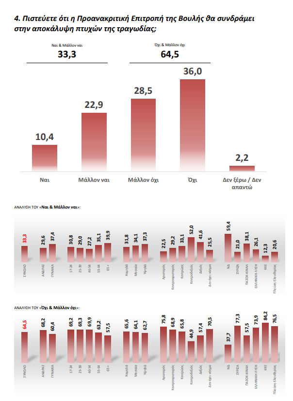 Πολύ σημαντικά συμπεράσματα προκύπτουν και από τις απαντήσεις των πολιτών ανάλογα είτε με την κομματική τοποθέτηση, είτε την ηλικία δείχνοντας ότι τον δρόμο για την δικαιοσύνη και την αλήθεια οδηγεί η νέα γενιά.