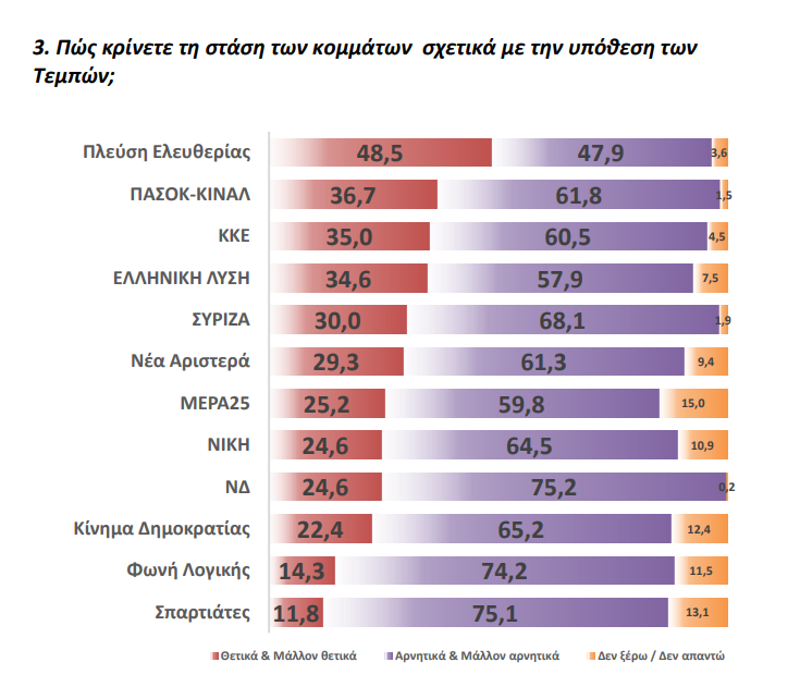 Η Πλεύση Ελευθερίας λαμβάνει τις περισσότερες θετικές ψήφους για την στάση της στην υπόθεση των Τεμπών. Παρά το γεγονός πως το ΠΑΣΟΚ δέχεται βέλη συνεχώς για την τακτική του περίπου 4 στους 10 συμφωνούν με τη στάση του. Σε μεγάλη αποδρομή η κυβέρνηση που ένα 75,2% απαντά με αρνητικό πρόσημο για τη στάση της.
