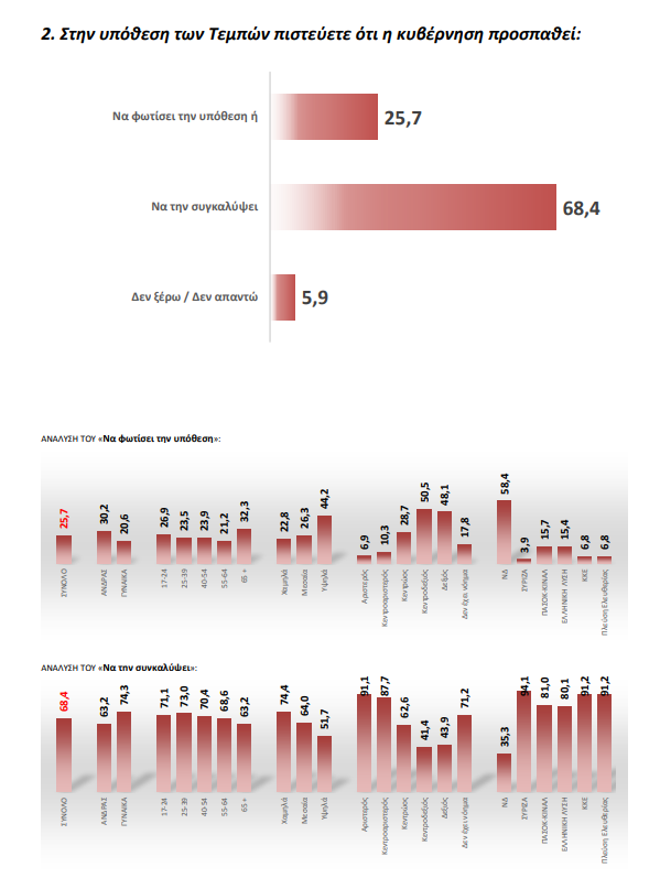 Είναι χαρακτηριστικό ότι η διαλεύκανση της υπόθεσης των Τεμπών θεωρείται από τους ερωτηθέντες ότι πρέπει να είναι προτεραιότητα για την κυβέρνηση σε ποσοστό 37,9% ακόμα και πιο ψηλά από την ακρίβεια (32,7%). 68,4% των απαντήσεων πιστεύουν ότι η κυβέρνηση προσπαθεί να συγκαλύψει.