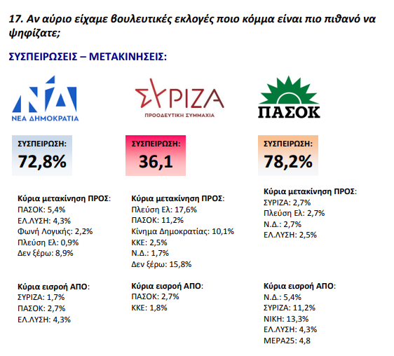 Στις συσπειρώσεις των κομμάτων το ΠΑΣΟΚ με 78,2% εισπράττει κυρίως από ΣΥΡΙΖΑ, ΝΙΚΗ, ΝΔ, Ελληνική Λύση και ΜΕΡΑ25 ενώ χάνει ελάχιστα προς άλλα κόμματα. Η χαμηλή συσπείρωση της ΝΔ οφείλεται κυρίως στις διαρροές προς την αδιευκρίνιστη ψήφο ενώ δείχνει να εισπράττει από την Ελληνική Λύση. Τέλος ο ΣΥΡΙΖΑ δείχνει και στα μεγέθη της συσπείρωσης την πολυδιάσπασή του με την Πλεύση Ελευθερίας, το ΠΑΣΟΚ και το Κίνημα Δημοκρατίας να είναι οι μεγάλοι ωφελούμενοι. Σημαντικό και το ποσοστό των αναποφάσιστων ψηφοφόρων του που δεν το έχουν εγκαταλείψει οριστικά ακόμη.