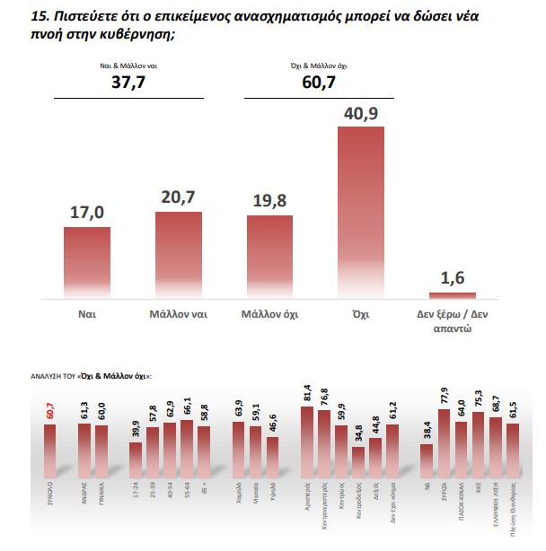 Όσον αφορά τον ανασχηματισμό το 60,7% απαντά αρνητικά στην ερώτηση εάν πιστεύουν ότι ο επικείμενος ανασχηματισμός μπορεί να δώσει νέα πνοή στην κυβέρνηση.
