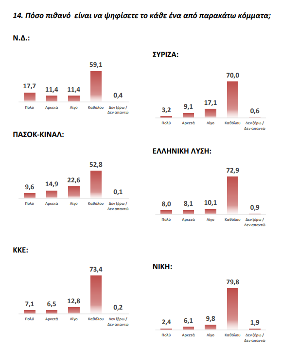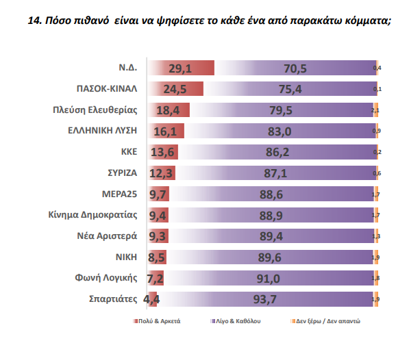 Στην πρόθεση ψήφου η ΝΔ έχει ποσοστό 23,4%. Ακολουθεί το ΠΑΣΟΚ με 15,1%. Στην τρίτη θέση ισοψηφούν η Πλεύση Ελευθερίας και η Ελληνική Λύση με 9%. Το ΚΚΕ βρίσκεται μόνο στην τέταρτη θέση με 7,8% ενώ ο ΣΥΡΙΖΑ διατηρείται σε χαμηλά ποσοστά αποδοχής, με μόλις 5,9% των ερωτηθέντων να απαντά ότι αν αύριο είχαμε βουλευτικές εκλογές θα το ψήφιζε. Ισχυρή σε ποσοστό είναι και η αδιευκρίνιστη ψήφος, καθώς ανέρχεται στο 12,1% των απαντήσεων.