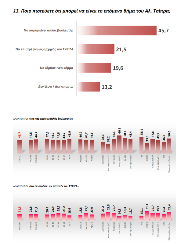 Το 45,7% των πολιτών πιστεύει ότι ο πρώην πρωθυπουργός Αλέξης Τσίπρας πρέπει να παραμείνει απλός βουλευτής, ενώ μόλις το 21,5% πιστεύει ότι μπορεί να επιστρέψει ως αρχηγός του ΣΥΡΙΖΑ. Πάντως, ένα ικανό ποσοστό 19,6% των ερωτηθέντων εκτιμά ότι ο Αλέξης Τσίπρας θα μπορούσε να ιδρύσει νέο κόμμα.