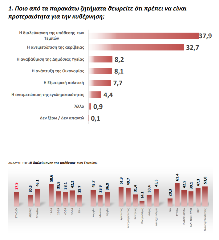 Είναι χαρακτηριστικό ότι η διαλεύκανση της υπόθεσης των Τεμπών θεωρείται από τους ερωτηθέντες ότι πρέπει να είναι προτεραιότητα για την κυβέρνηση σε ποσοστό 37,9% ακόμα και πιο ψηλά από την ακρίβεια (32,7%). 68,4% των απαντήσεων πιστεύουν ότι η κυβέρνηση προσπαθεί να συγκαλύψει.