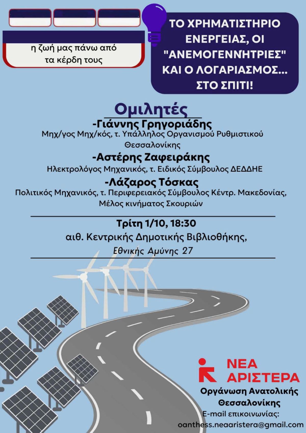 To χρηματιστήριο ενέργειας, οι “ανεμογεννήτριες” και ο λογαριασμός…στο σπίτι “η ζωή μας πάνω από τα κέρδη τους” είναι το κεντρικό θέμα της εκδήλωσης της Νέας Αριστεράς Θεσσαλονίκης, που θα πραγματοποιηθεί την 1η Οκτωβρίου στη Θεσσαλονίκη.