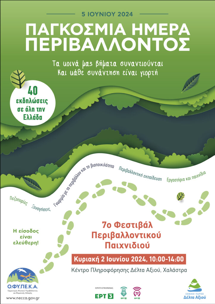 Με μία όμορφη γιορτή για τα παιδιά θα εορταστεί και φέτος η Παγκόσμια Ημέρα Περιβάλλοντος στο Εθνικό Πάρκο Δέλτα Αξιού. Την Κυριακή 2 Ιουνίου, θα πραγματοποιηθεί το 7ο Φεστιβάλ Περιβαλλοντικού Παιχνιδιού, στο Κέντρο Πληροφόρησης Δέλτα Αξιού, στη Χαλάστρα, με περιβαλλοντικά παιχνίδια, εργαστήρια κατασκευών, μουσικοθεατρικό εργαστήριο, παρουσίαση παιδικού βιβλίου, κουκλοθέατρο και αφήγηση παραμυθιών, με θέμα πάντα το περιβάλλον και με στόχο να ευαισθητοποιηθούν μικροί και μεγάλοι για την ανάγκη προστασίας του.