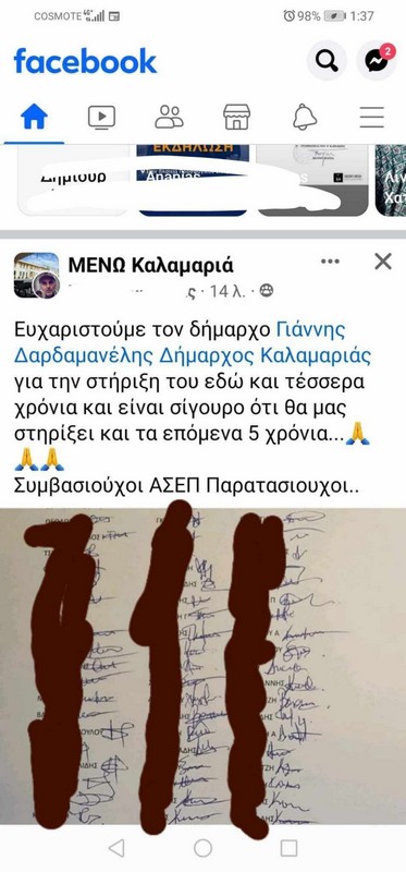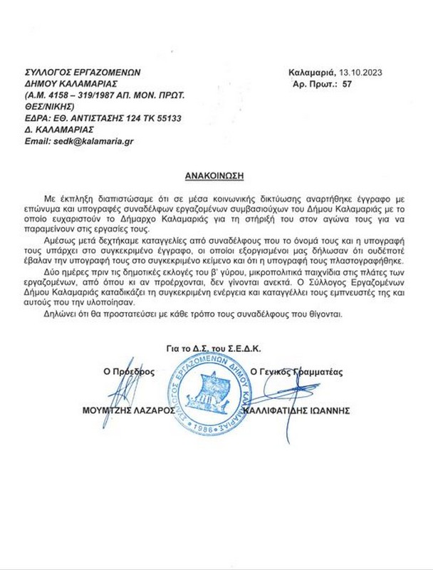 Σύμφωνα με την ανακοίνωση του Συλλόγου Εργαζομένων Δήμου Καλαμαριάς, εργαζόμενοι συμβασιούχοι κατήγγειλαν την ύπαρξη του ονόματός τους σε λίστα προσώπων που στηρίζουν τον κ. Δαρδαμανέλη αλλά και την πλαστογράφηση των υπογραφών τους!