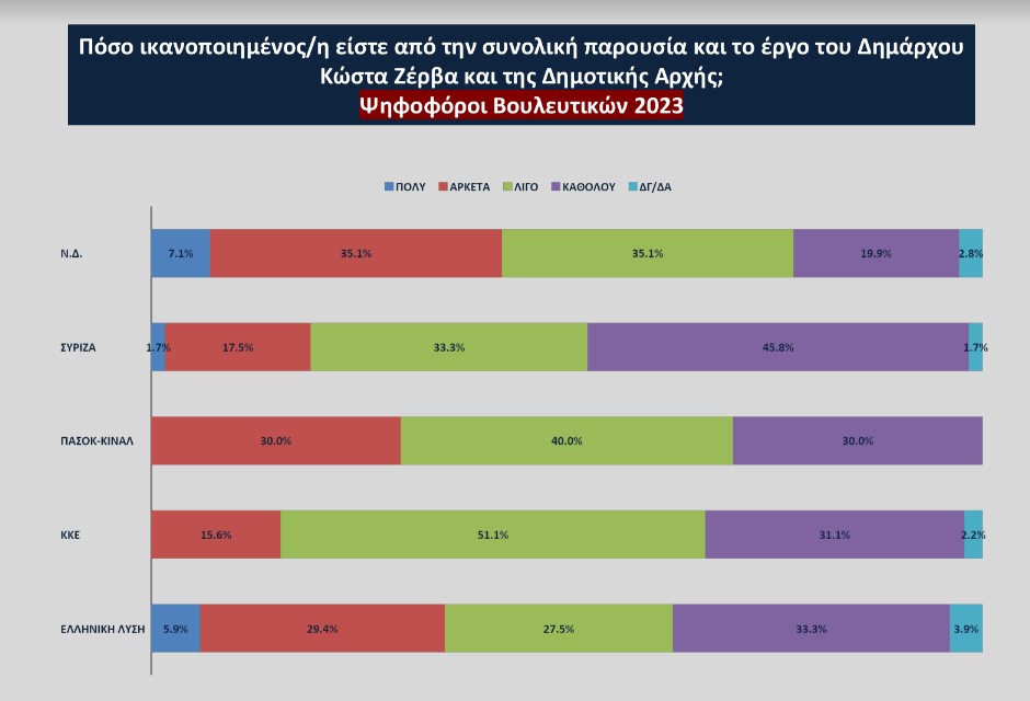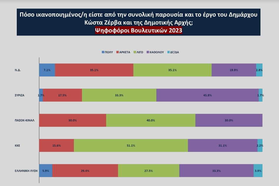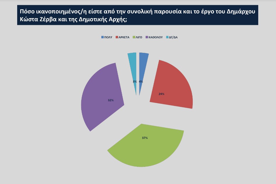 Ικανοποιημένοι από την συνολική παρουσία και το έργο του Δημάρχου Κώστα Ζέρβα δηλώνουν μόλις το 28%, ενώ το 69% δηλώνει λίγο και καθόλου ικανοποιημένο. Πρόκειται για χαμηλή συνολικά αξιολόγηση , η οποία εξηγείται με σαφήνεια αν δούμε την αξιολόγηση του έργου του σε σειρά τομέων δημοτικής δραστηριότητας. Είναι χαρακτηριστικές οι επιδόσεις στα τρία προβλήματα του Δήμου που δηλώνονται από τους δημότες ως τα προβλήματα που απασχολούν περισσότερο. Αυτά είναι η καθαριότητα με 60.1%, η στάθμευση/ πάρκινγκ με 26.5% και το κυκλοφοριακό με 19.2%. Σ΄αυτά η ικανοποίηση από το έργο του Δημάρχου είναι: Για την καθαριότητα 18.6%, για τους χώρους στάθμευσης 11% και για τοπ κυκλοφοριακό 13.4%. Ωστόσο συνολικότερα, με εξαίρεση την εξυπηρέτηση των πολιτών από τις δημοτικές υπηρεσίες που η αξιολόγηση είναι θετική με 41.3% και ο τομέας πολιτισμού/αθλητισμού που η ικανοποίηση βρίσκεται στα επίπεδα του 35.1%, σε όλους τους άλλους τομείς η ικανοποίηση βρίσκεται στο 30% και κάτω. Στα θέματα περιβάλλοντος 30.4%, στην κοινωνική πολιτική με 24.6%, στην κατάσταση οδών, πλατειών, πάρκων με 24.1%, στην κατάσταση των σχολείων και των παιδικών σταθμών με 23.4%.