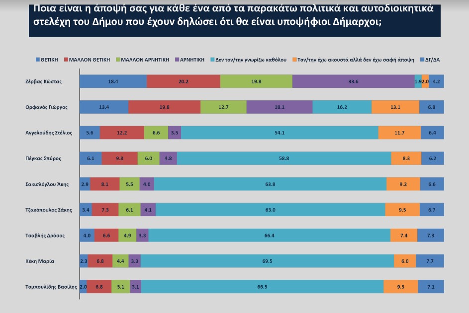Ο Δήμαρχος Κώστας Ζέρβας και η Δημοτική Αρχή εμφανίζουν μια προβληματική εικόνα ως προς την αξιολόγηση από τους δημότες του έργου αυτά τα χρόνια και αυτό επηρεάζει τις δημοσκοπικές επιδόσεις τους Δημάρχου σε όλα τα ευρήματα μέχρι και την πρόθεση ψήφου. Υπάρχει δηλαδή μια ρευστή κατάσταση στην οποία εμφανίζονται ήδη τα πρώτα ευρήματα για τους υποψήφιους Δημάρχους που έχουν δηλώσει ή που έχει ακουστεί ότι θα είναι υποψήφιοι, με τον Στέλιο Αγγελούδη να δείχνει να προβάλει αυτή την στιγμή ως ο βασικός αντίπαλος του νυν Δημάρχου.