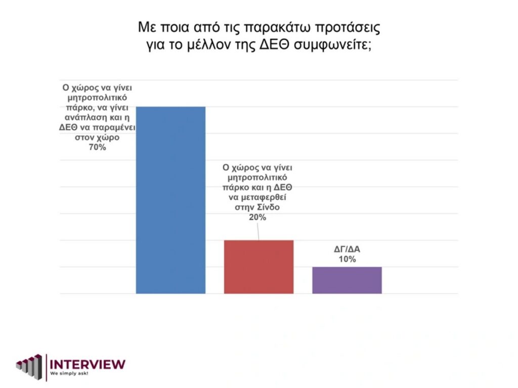 Όσον αφορά την ανάπλαση της ΔΕΘ, το 70% ζητά ο χώρος να γίνει μητροπολιτικό πάρκο, για να γίνει η ανάπλαση με την έκθεση να παραμείνει στο κέντρο της πόλης. Ένα μόλις 20% ζητά πλέον την μετεγκατάστασή της.