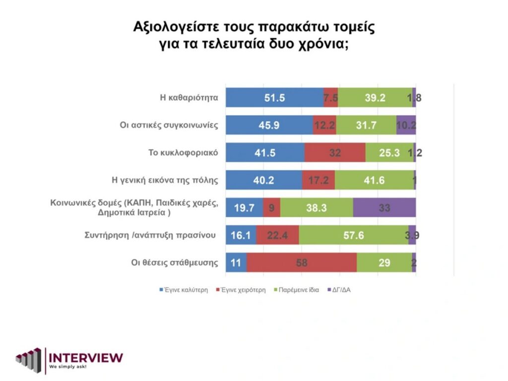 Αναφορικά με τα βασικά θέματα καθημερινότητας των πολιτών, το 51,5% θεωρεί ότι τα πραγματα είναι καλύτερα στην καθαριότητα, το 45,9% στις αστικές συγκοινωνίες, το 41,5% το κυκλοφοριακό. Το 40,2% θεωρεί ότι είναι καλύτερη η εικόνα της πόλης, ενώ ένα 41,6% εκτιμά ότι έμεινε η ίδια. Μικρότερα τα ποσοστά σε Κοινωνικές δομές (19,7%), πράσινο (16,1% έναντι 22,4% που λέει ότι έγινε χειρότερη) και θέσεις στάθμευσης όπου μόλις το 11% θεωρεί ότι η καθημερινότητα είναι καλύτερη ενώ ένα 58% δίνει αρνητική αξιολόγηση.