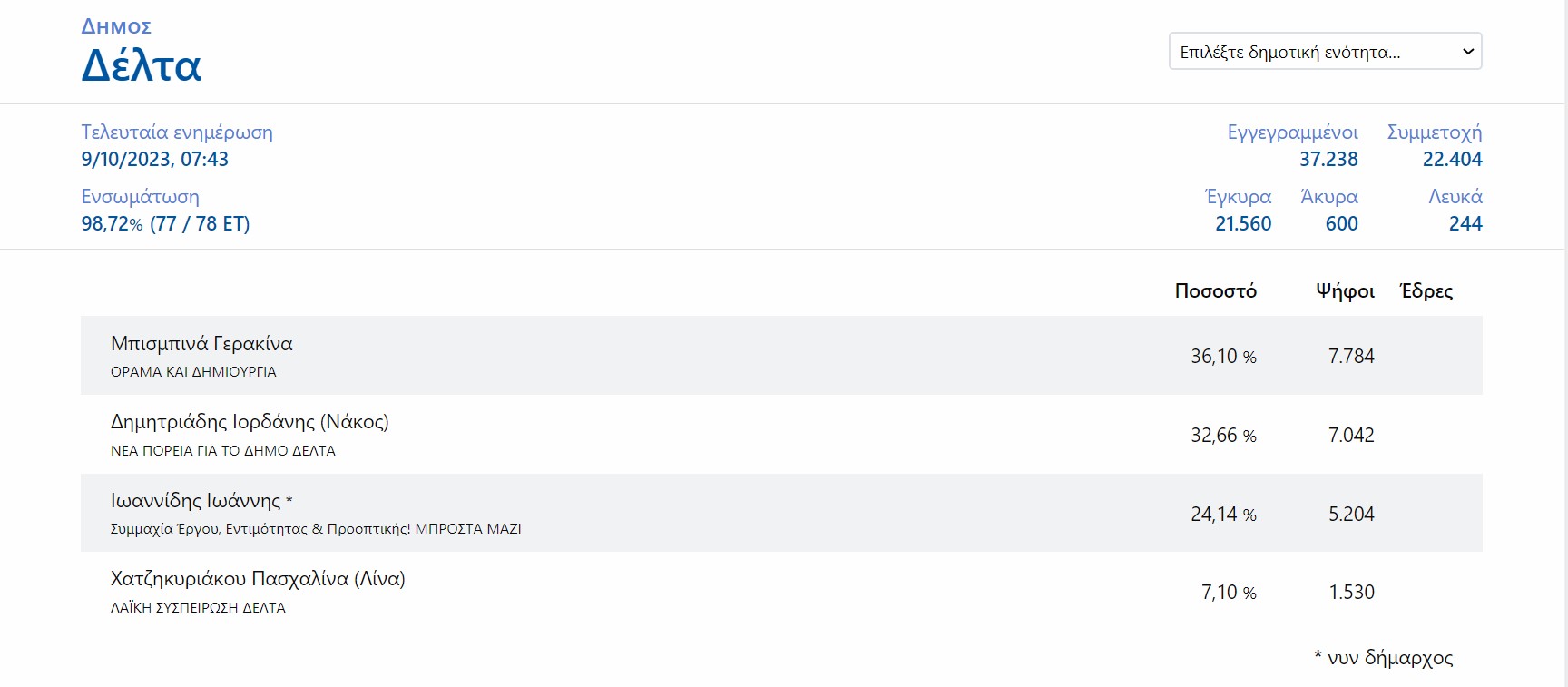 Στο δήμο Δέλτα την πρώτη θέση με 35,81% έχει η Γερακίνα Μπισμπινά και στην δεύτερη θέση με 32,92% βρίσκεται ο Ιορδάνης Δημητριάδης (Νάκος), ενώ ο νυν δήμαρχος του δήμου Δέλτα Γιάννη Ιωαννίδης βρέθηκε στη τρίτη θέση συγκεντρώνοντας το 24,14%.