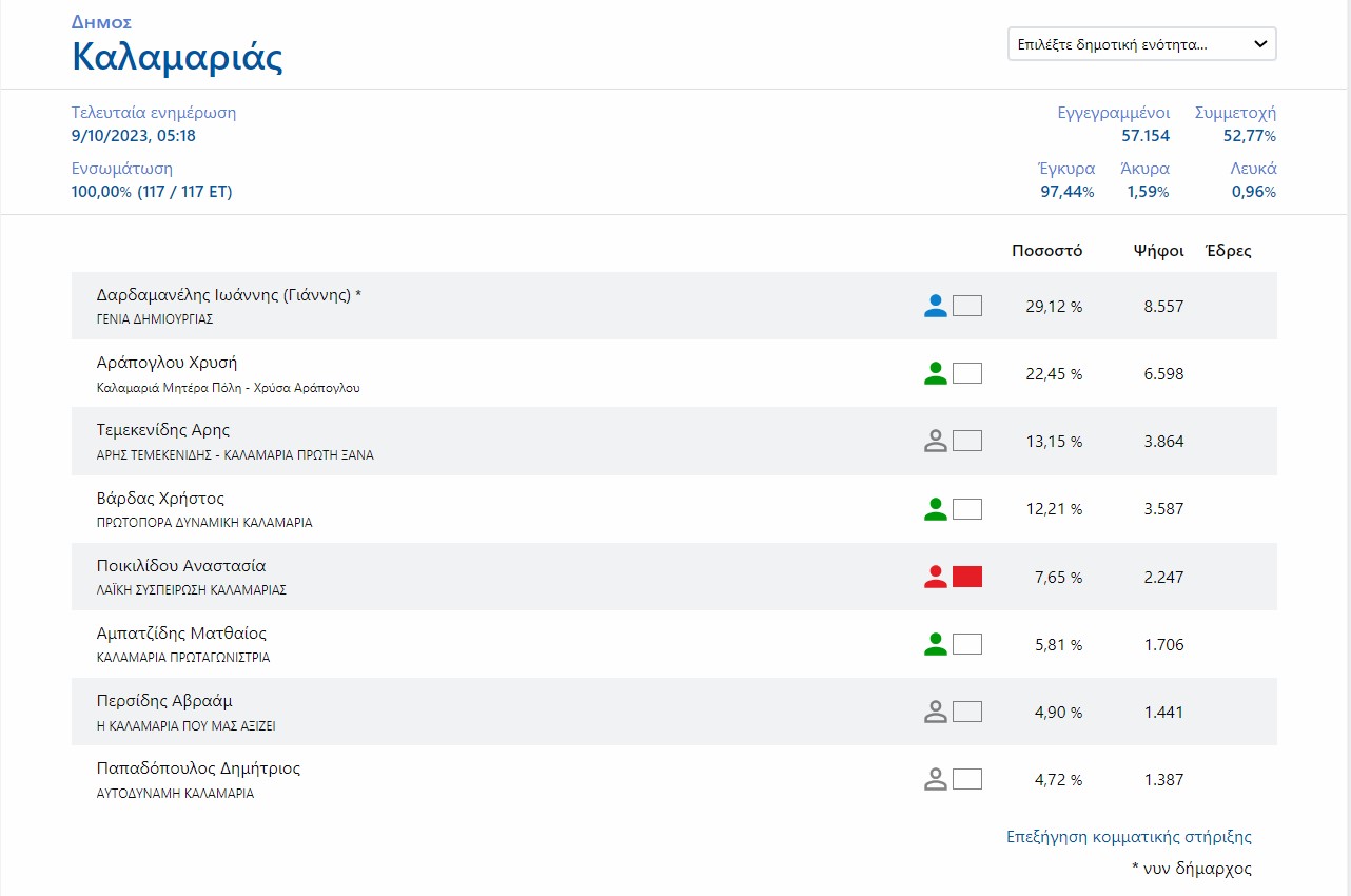 Στο δήμο Καλαμαριάς, ο νυν δήμαρχος, Γιάννης Δαρδαμανέλης συγκέντρωσε το 29,12% ενώ στη δεύτερη θέση βρίσκεται η Χρύσα Αράπογλου με 22,45%.
