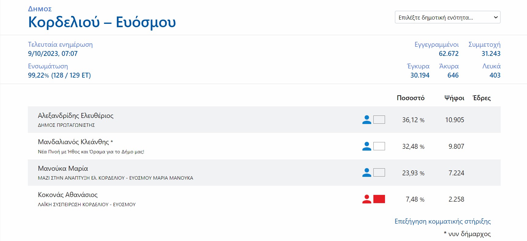 Στο δήμο Κορδελιού – Ευόσμου σε β γύρο εκλογικής αναμέτρησης θα πάνε ο Ελευθέριος Αλεξανδρίδης με 36,11% και ο νυν δήμαρχος Κλεάνθης Μανδαλιανός με 32,54%.