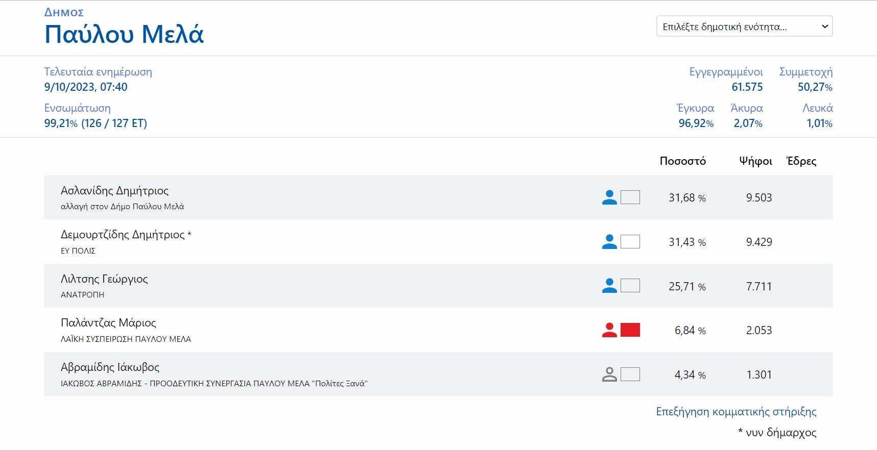 Στον δήμο Παύλου Μελά αναμένεται ντέρμπι μεταξύ των Δημήτρη Ασλανίδη και Δημήτρη Δεμουρτζίδη. Ο πρώτος κατάφερε να συγκεντρώσει το 31,74% με τον νυν δήμαρχο να βρίσκεται μια ανάσα μακριά παίρνοντας το 31,31%.