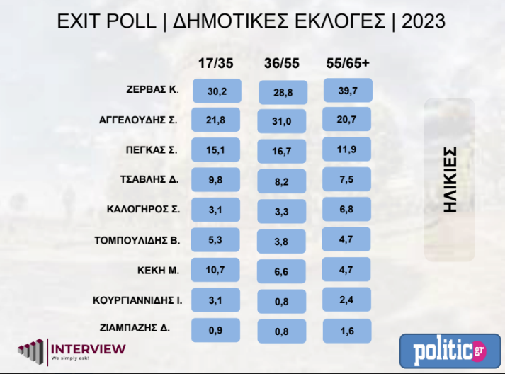 Οι ηλικίες 17 – 35 ετών επιλέγουν Κωνσταντίνο Ζέρβα, ενώ αντίθετα ο Στέλιος Αγγελούδης κερδίζει τις πιο παραγωγικές ηλικίες 36 – 55 ετών.
