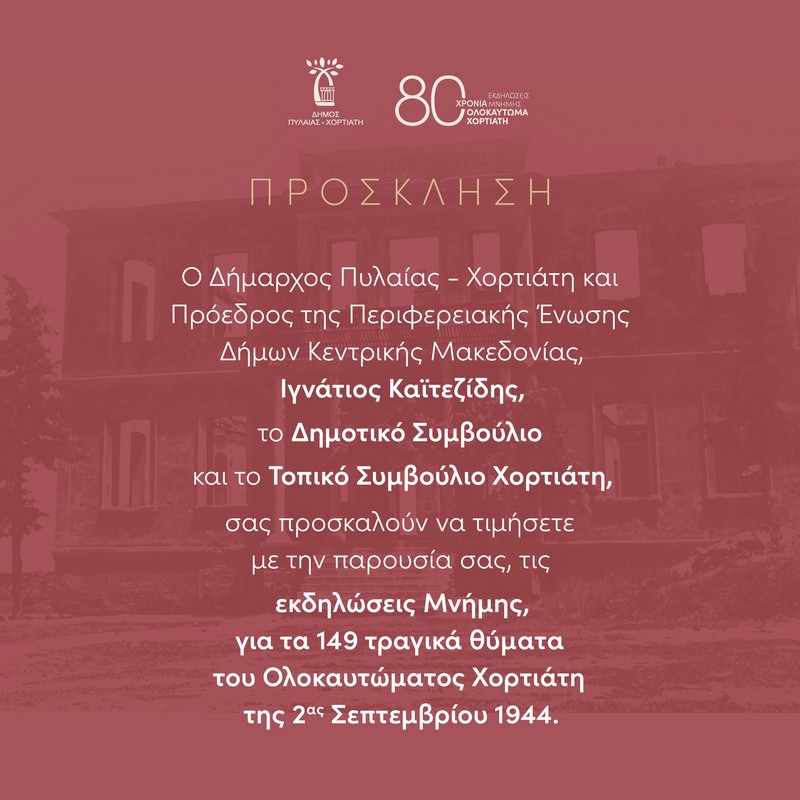 Ογδόντα χρόνια συμπληρώνονται φέτος από το Ολοκαύτωμα του Χορτιάτη και ο δήμος Πυλαίας – Χορτιάτη μαζί με την τοπική κοινωνία τιμούν την ιστορική Μνήμη με μία σειρά εκδηλώσεων.