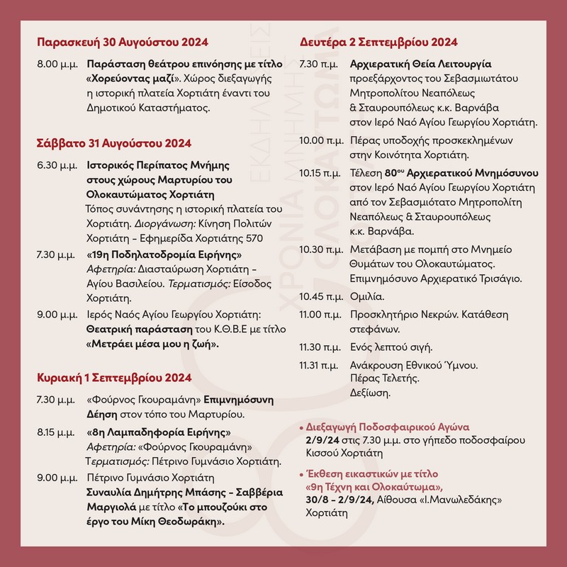 Ξεκινούν από την Παρασκευή 30 Αυγούστου και περιλαμβάνουν παράσταση – δρώμενο από τη Bloom Theatre Group, θεατρική παράσταση από το ΚΘΒΕ και μουσική συναυλία των Δ. Μπάση – Σ. Μαργιολά με τραγούδια του Μίκη Θεοδωράκη, ιστορικό περίπατο μνήμης, ποδηλατοδρομία ειρήνης και λαμπαδηδρομία ειρήνης ενώ κορυφώνονται τη Δευτέρα 2 Σεπτεμβρίου, ημέρα που διαπράχθηκε το ναζιστικό έγκλημα, με Αρχιερατικό Μνημόσυνο στον Ιερό Ναό Αγίου Γεωργίου Χορτιάτη από τον Σεβασμιότατο Μητροπολίτη Νεαπόλεως & Σταυρουπόλεως κ.κ. Βαρνάβα, κατάθεση στεφάνων και προσκλητήριο νεκρών.