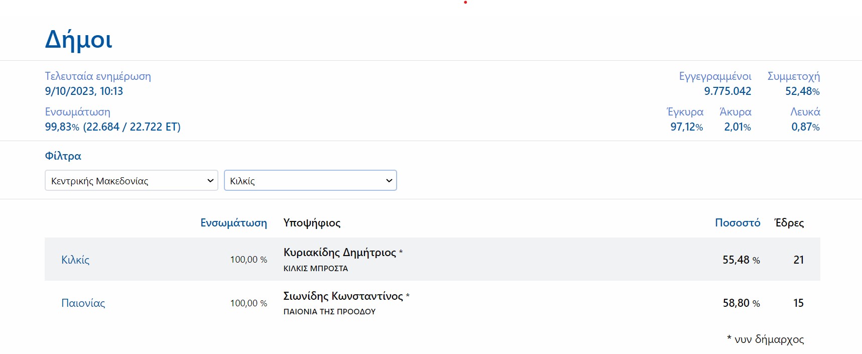 Δυο στα δυο για τον νομό Κιλκίς, ο οποίος δε θα χρειαστεί να οδηγηθεί εκ νέου στις κάλπες την Κυριακή 15 Οκτωβρίου για β’ γύρο.