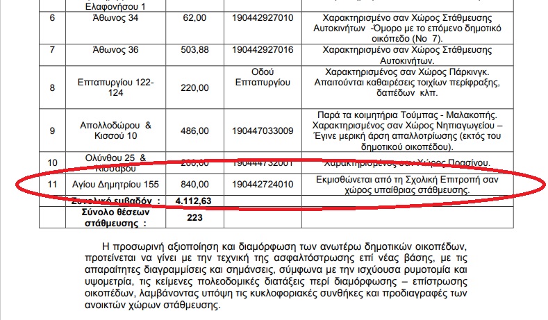 Το οικόπεδο της Αγίου Δημητρίου 155 ξεχώριζε στη μικρή λίστα του, καθώς ήταν το μόνο για το οποίο αναγραφόταν ότι «εκμισθώνεται από τη Σχολική Επιτροπή ως χώρος στάθμευσης».