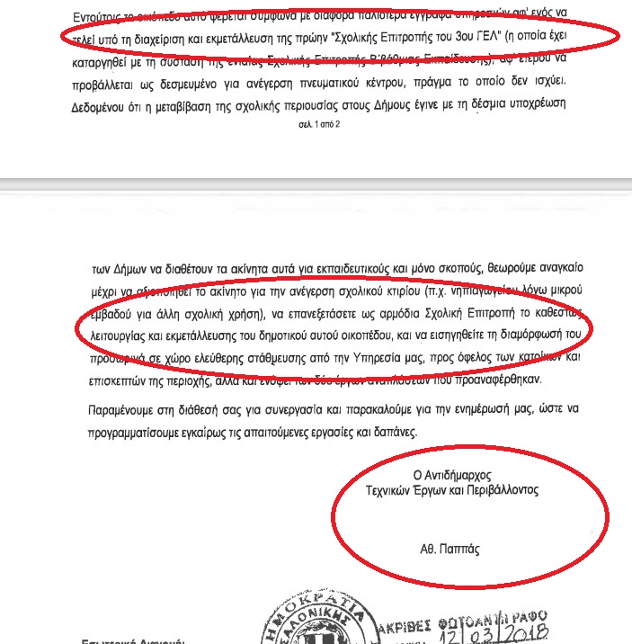 Παράλληλα η δημοτική παράταξη συμπληρώνει ότι «οκτώ χρόνια αργότερα, το 2018, ο επίσης Σύμβουλος του σημερινού Δημάρχου κ. Αθανάσιος Παππάς, ως Αντιδήμαρχος Τεχνικών Έργων τότε, διαπιστώνει ότι το ακίνητο «φέρεται να τελεί υπό διαχείριση και εκμετάλλευση της πρώην Σχολικής Επιτροπής». Κι όμως είναι σίγουρα ενήμερος για την υπόθεση από το 2014, λόγω αλληλογραφίας και εν συνεχεία αγωγής που κατατέθηκε από πολίτη στη Δικαιοσύνη σχετικά με το εν λόγω ακίνητο. Και τι έκανε από το 2014 ως το 2018; Ζήτησε ΕΔΕ; Προσέφυγε κάπου αλλού; Όχι, όπως προκύπτει από τη σχετική αλληλογραφία! Περιορίστηκε να ζητήσει από τη νέα ενιαία Σχολική Επιτροπή του Δήμου Θεσσαλονίκης «να επανεξετάσει το καθεστώς λειτουργίας και εκμετάλλευσης του οικοπέδου».
