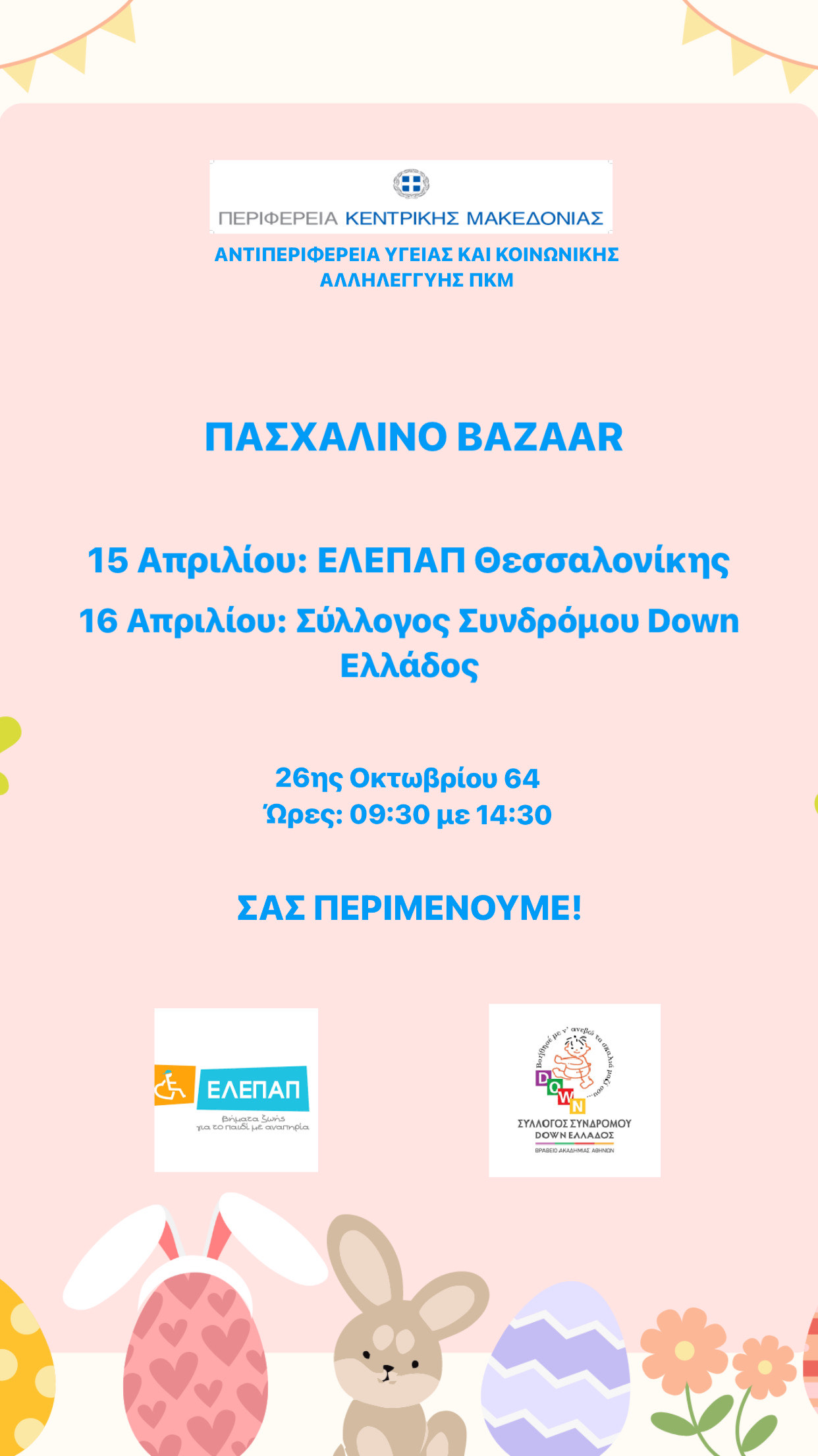 Πασχαλινά bazaar της ΕΛΕΠΑΠ Θεσσαλονίκης και του Συλλόγου Συνδρόμου Down Ελλάδος φιλοξενεί η Περιφέρεια Κεντρικής Μακεδονίας, μέσω της Αντιπεριφερέρειας Υγείας και Κοινωνικής Αλληλεγγύης, με σκοπό να συνδράμει το έργο τους.