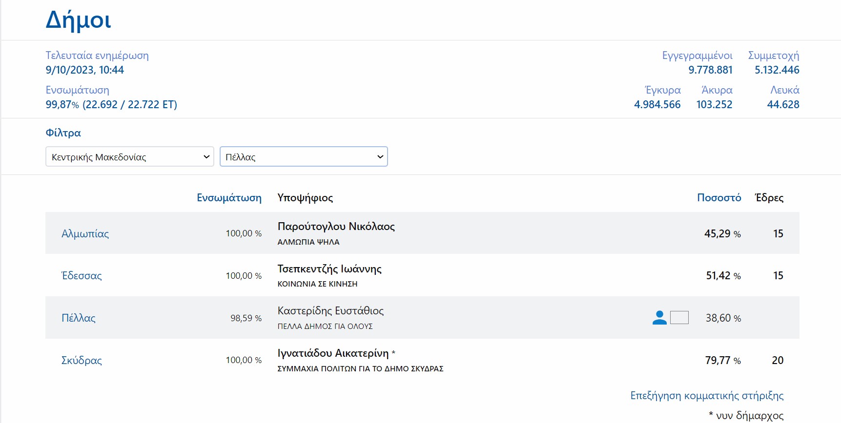 Τέλος, στον δήμο Πέλλας πρώτος ήρθε ο Στάθης Καστερίδης με 38,6% και δεύτερος ο Στάθης Φουντουκίδης με 31,11%. Οι δυο άντρες δίνουν λοιπόν ραντεβού στον δεύτερο γύρο!