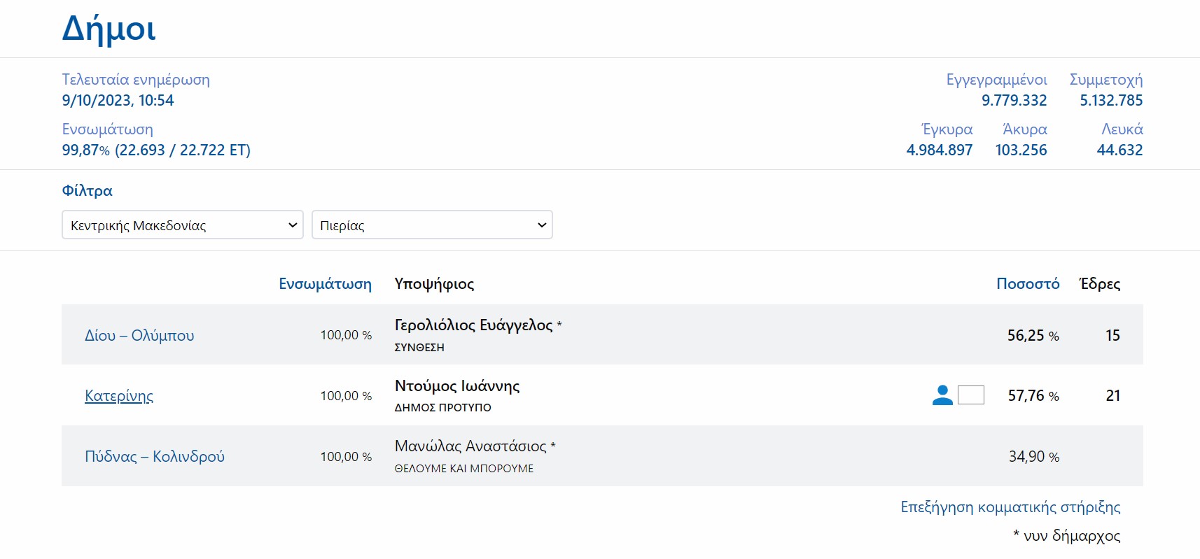 Πιο αναλυτικά, ο Βαγγέλης Γερολιόλιος επανεκλέγεται στον δήμο Δίου – Ολύμπου με 56,25%, ενώ νέος δήμαρχος στον δήμο Κατερίνης είναι ο Γιάννης Ντούμος με 57,76%.