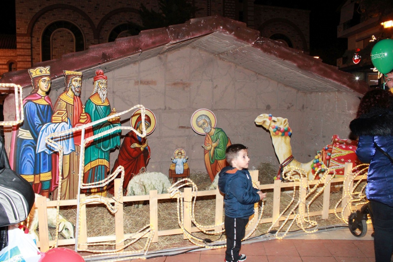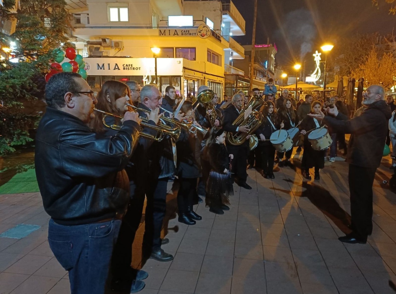 Είχαν προηγηθεί χριστουγεννιάτικα τραγούδια από τη φιλαρμονική του δήμου, ενώ κλόουν ανιματέρ και ένας Άγιος Βασίλης διασκέδαζαν με παιχνίδια τα παιδιά μπροστά στη μικρή σκηνή, στην είσοδο του δημαρχείου.