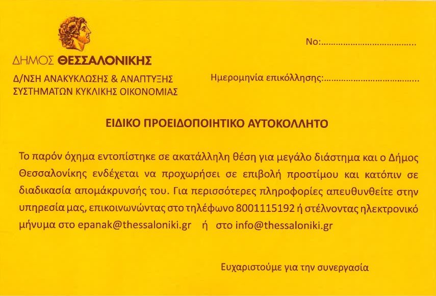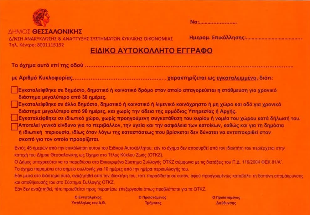 Εφεξής σε κάθε καταγγελία που θα γίνεται από δημότες ή από τους επόπτες-ελεγκτές ο Δήμος θα προειδοποιεί τον ιδιοκτήτη με ένα ΝΕΟ πορτοκαλί προειδοποιητικό αυτοκόλλητο όπου θα επισημαίνεται ότι ο Δήμος έχει μπει στην διαδικασία ενημέρωσης του κατόχου να αποσύρει το αυτοκίνητό του για να μην χαρακτηρισθεί εγκαταλειμμένο.