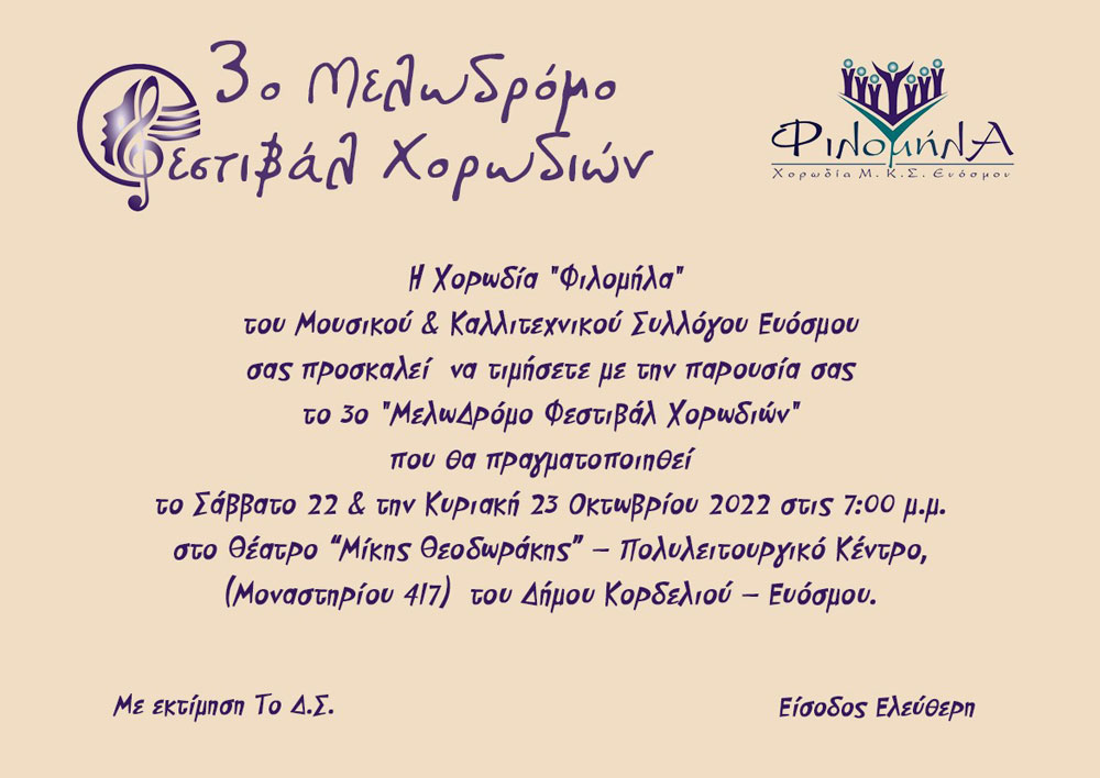 Ο Μουσικός & Καλλιτεχνικός Σύλλογος Ευόσμου «Φιλομήλα», συνεχίζοντας ακάθεκτα την πολιτιστική του δράση υπό την καλλιτεχνική καθοδήγηση της μαέστρου Άννας – Μαρίας Κότσιφα, διοργανώνει το 3ο «Μελωδρόμο Φεστιβάλ Χορωδιών».