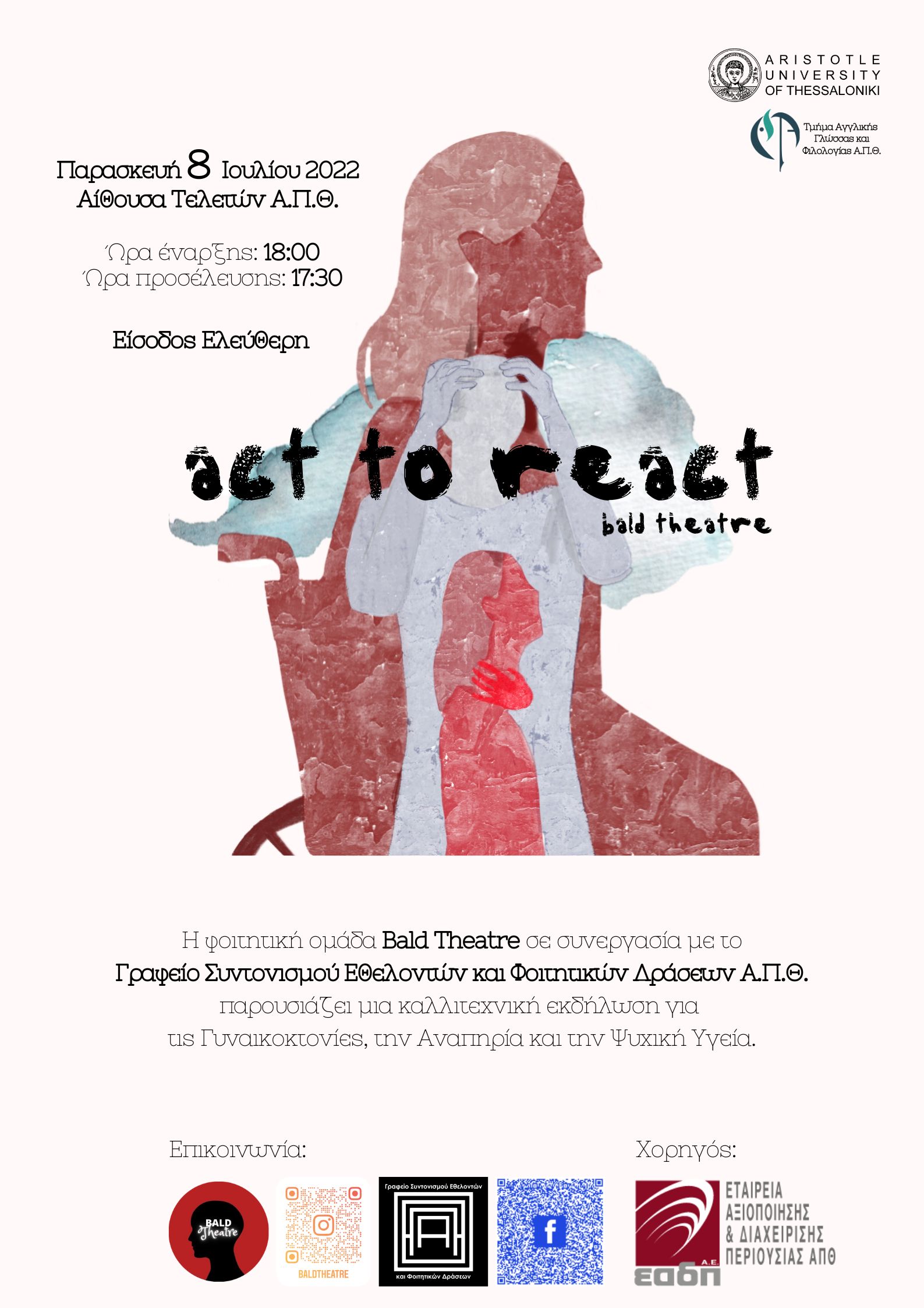 Μια άκρως ενδιαφέρουσα και φρέσκια καλλιτεχνική εκδήλωση για τις Γυναικοκτονίες, την Αναπηρία και την Ψυχική Υγεία, θα παρουσιαστεί αύριο, Παρασκευή στην αίθουσα τελετών του ΑΠΘ από τη φοιτητική, θεατρική ομάδα BALD THEATRE του Τμήματος Αγγλικής Γλώσσας και Φιλολογίας του Πανεπιστημίου.